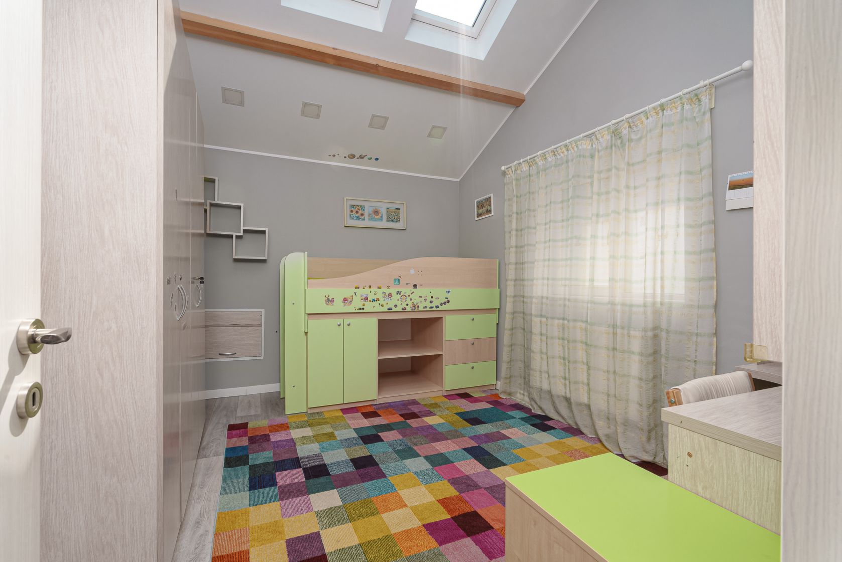 •Dormitor pentru Copii: Cameră luminoasă și prietenoasă, perfectă pentru copii.