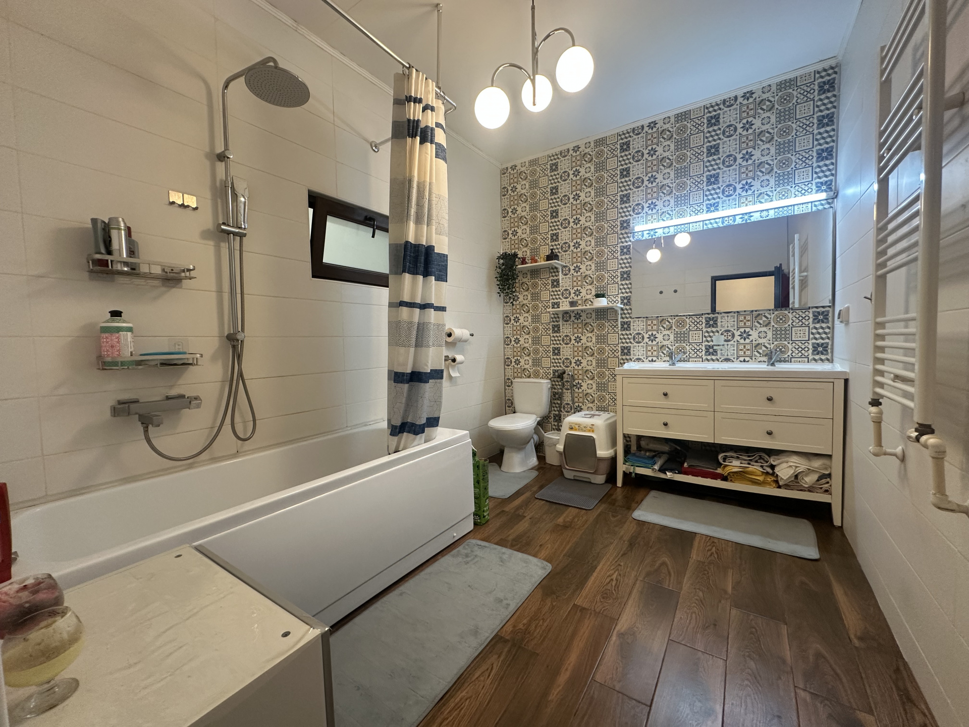 Casa este total mobilata si utilata, are 4 camere: Living spatios, trei dormitoare luminoase, 2 dressinguri, bucataria mare cu camara, are iesire catre terasa din spatele casei, camera tehnica cu centrala termica, baie mare cu cada si fereastra.