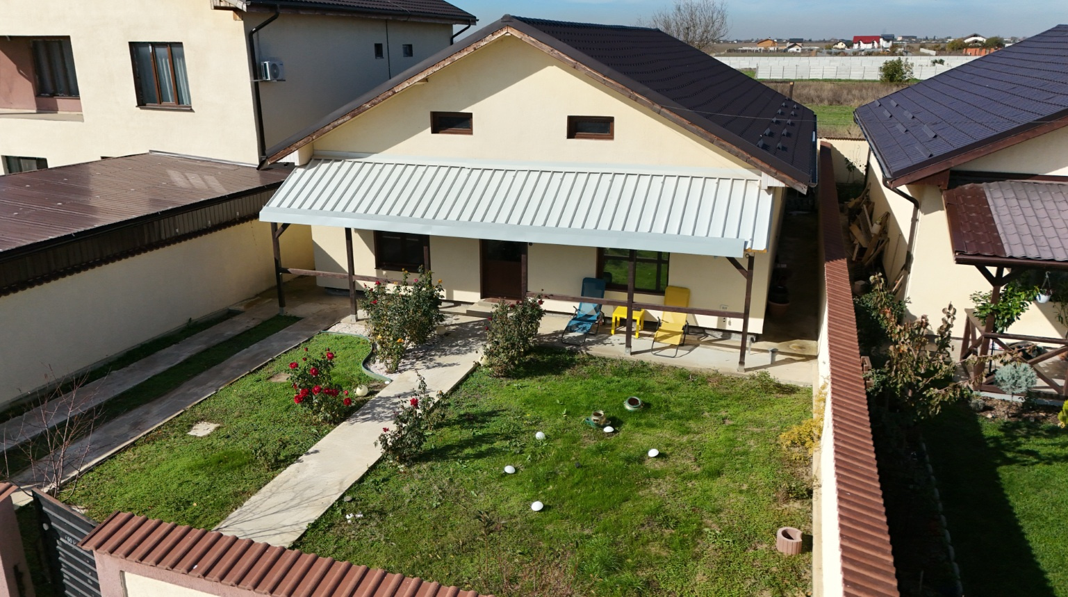 In fata casei este o terasa acoperita si gradina cu flori.