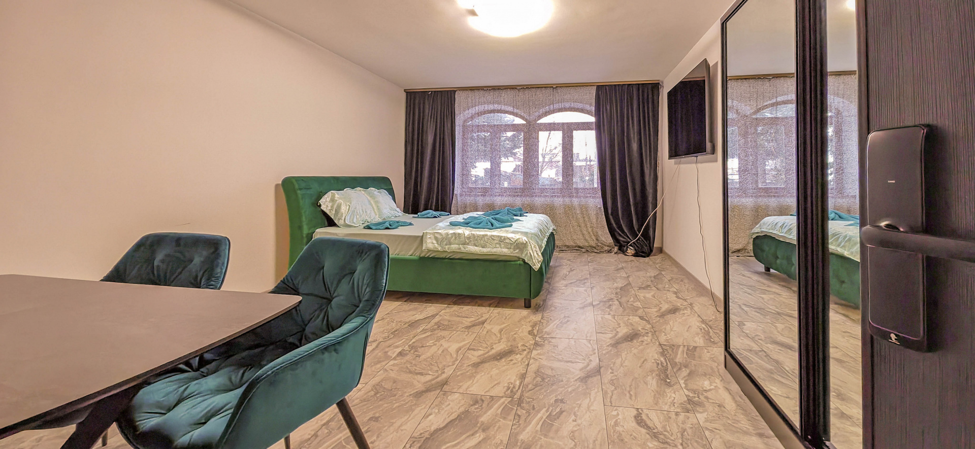 Mobilat complet: dormitoare cu mobilier din lemn masiv și tapițerie din piele, bucătărie utilată funcțional