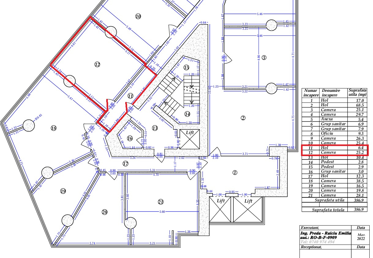 Spațiul de birouri se află la etajul 5, dispune de o cameră la care se adauga un hol propriu (poate fi folisit ca depozitare) având suprafața utilă de 31.6 mp, la care se adaugă spatiile comune. Spațiul are acces la doua grupuri sanitare comune.