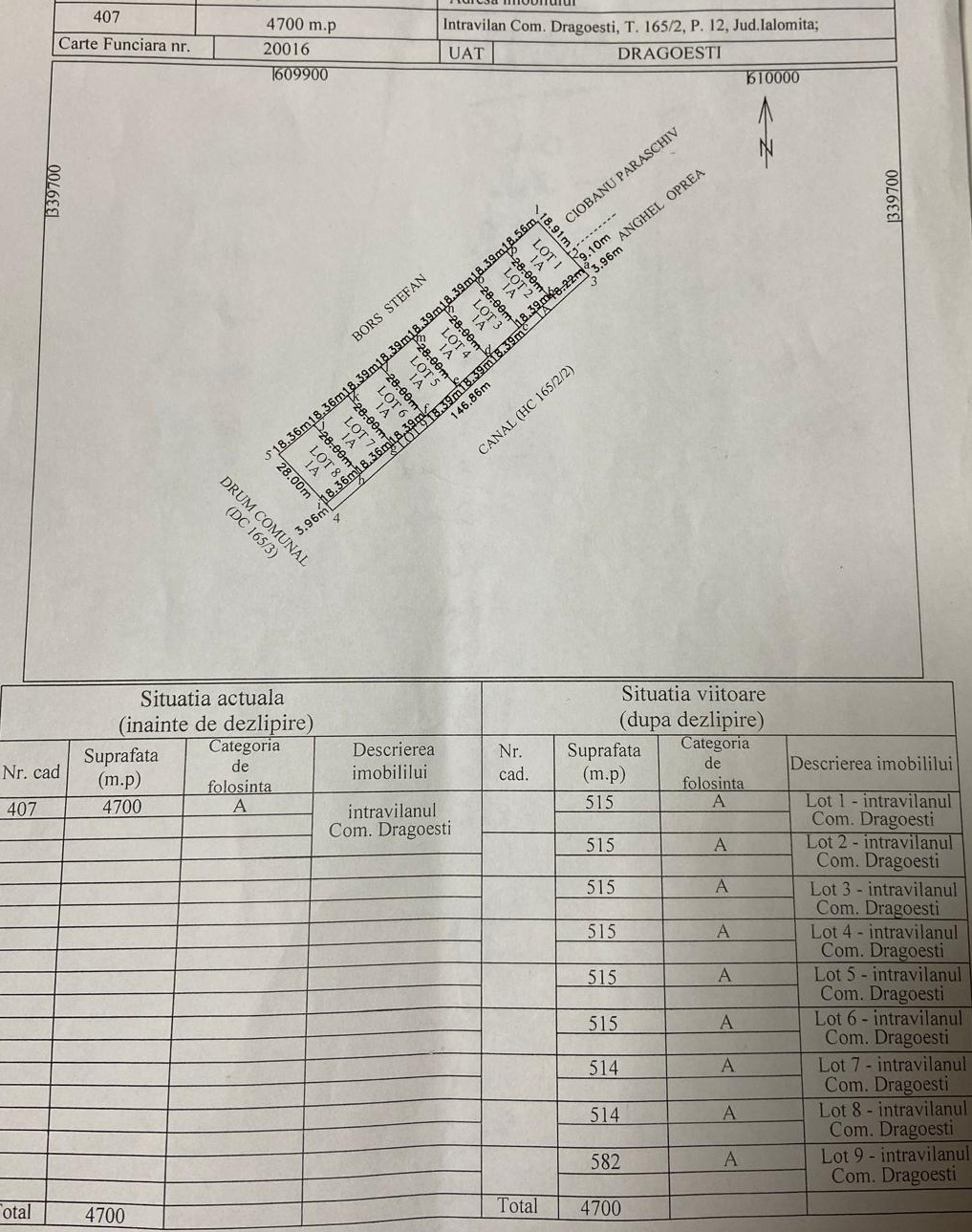 Parcelare: 9 loturi (~500–515 mp), Acces din drum communal asfaltat;